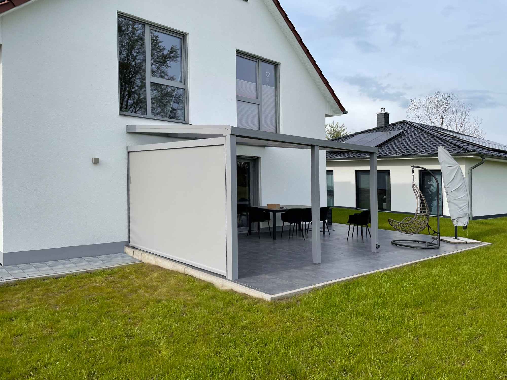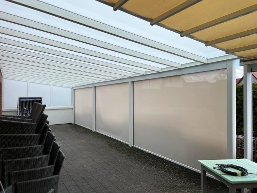Die Senkrechtmarkise eignet sich ideal als seitlicher Sonnen- und Sichtschutz für Ihre Terrassenüberdachung.